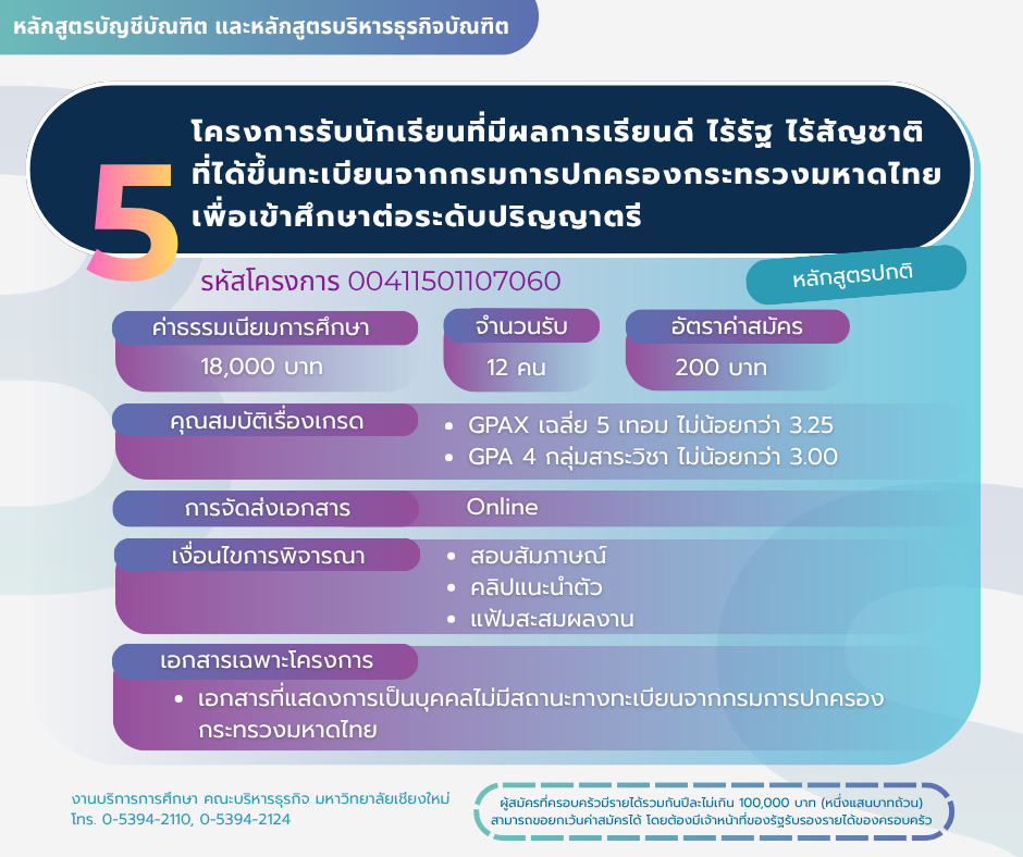 โครงการรับนักเรียนที่มีผลการเรียนดี ไร้รัฐ ไร้สัญชาติที่ได้ขึ้นทะเบียนจากกรมการปกครอง กระทรวงมหาดไทย เพื่อเข้าศึกษาต่อระดับปริญญาตรี