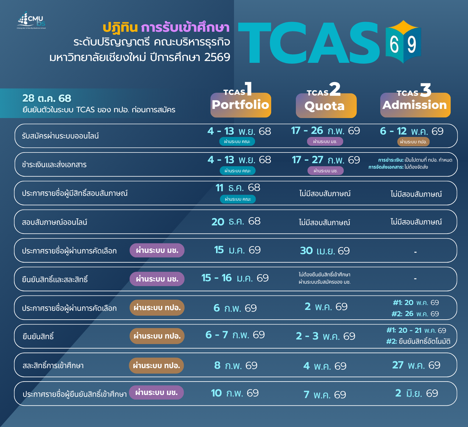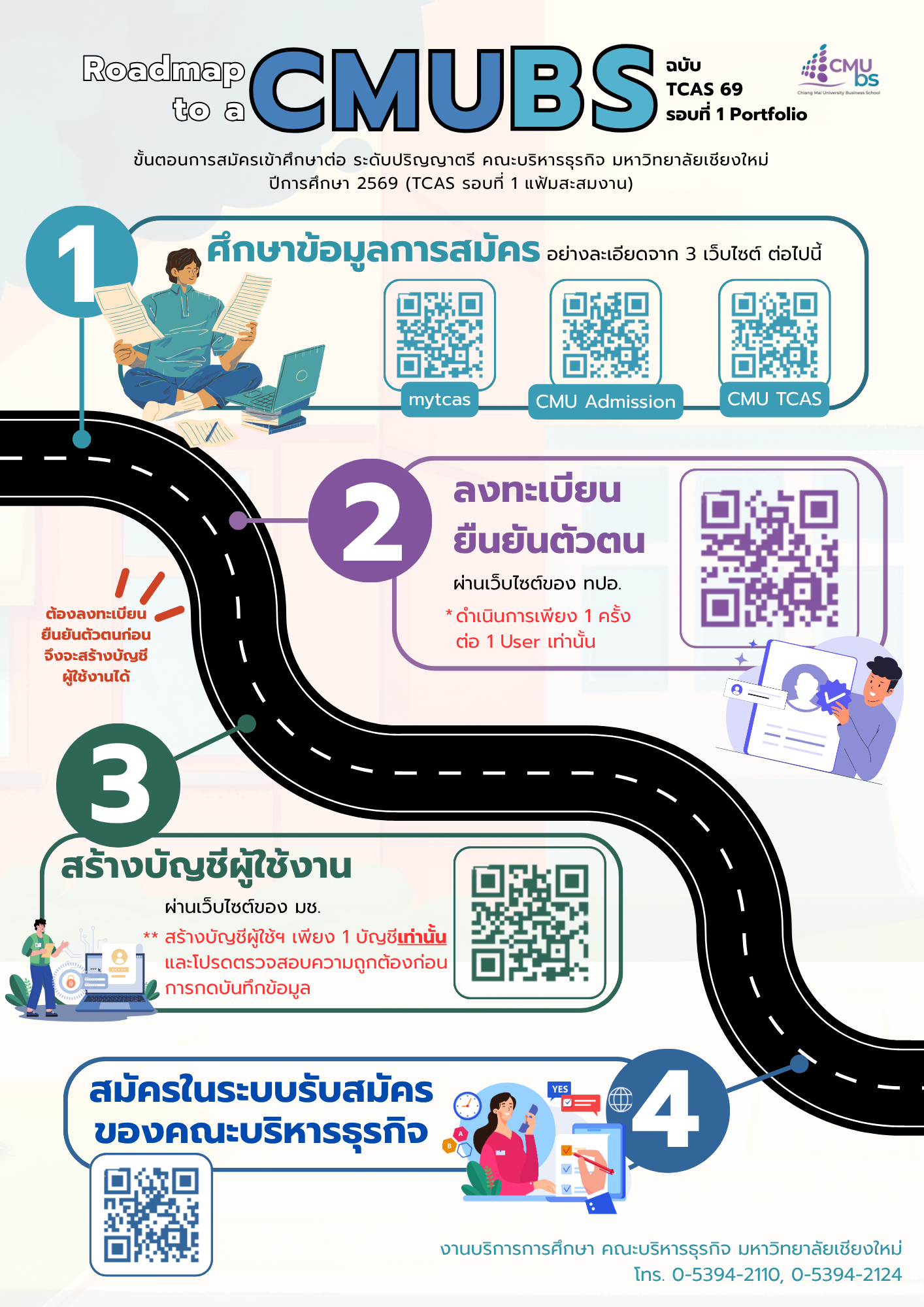 - 053-94-2110 หรือ ittipon.s@cmu.ac.th โดยใช้อีเมล์ที่แจ้งไว้ในการสมัคร พร้อมแจ้งเลขที่ใบสมัคร ชื่อ-นามสกุล